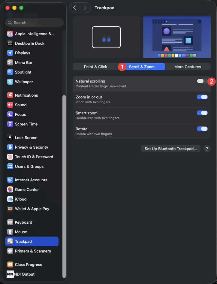 3. Next, select the middle section titled "Scroll & Zoom". The option to enable/disable Natural Scrolling is at the top. If you hover the mouse cursor over that section, you see an animated preview of the scrolling behavior when Natural Scrolling is either enabled or disabled. Decide which option that you prefer.