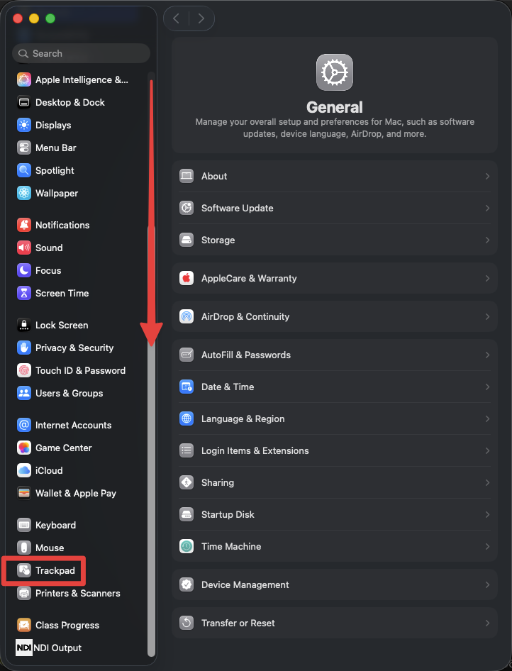 2. In the Systems Settings window, along the left sidebar, scroll down until you see "Trackpad", and click it to enter the submenu.