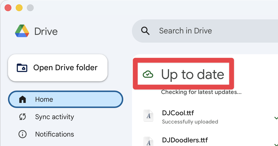 If the Google Drive [1] icon in the menu bar is spinning, a backup is currently in progress. To view more details, click that icon to open the application window. Within the app, select the Home [2] tab to see if the system is still syncing your files [3].